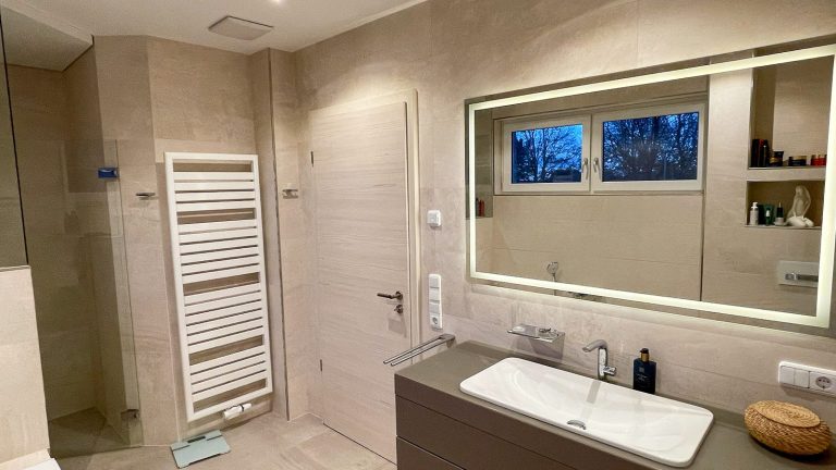 Badezimmer aus Sandstein in Großfliesenformat.